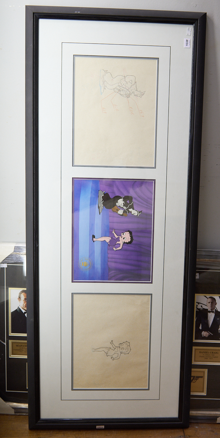 A NICELY FRAMED BETTY BOOP FRAMED DISPLAY WITH SERICEL AND ORIGINAL DRAWINGS OF BETTY AND KOKO THE CLOWN 50 X 127CM (OVERALL), LEONARD JOEL LOCAL DELIVERY SIZE: MEDIUM
