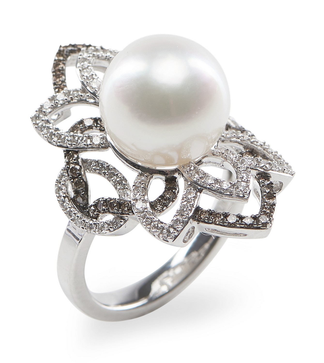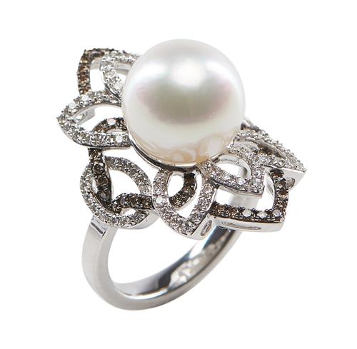 A SOUTH SEA PEARL, COGNAC DIAMOND AND DIAMOND RING BY AUTORE - The floral style plaque centred with a round pearl of silver white hues, measuring 11.0mm, within an open surround of cognac and white diamonds totalling 0.826cts, in 18ct white gold, ring size M.