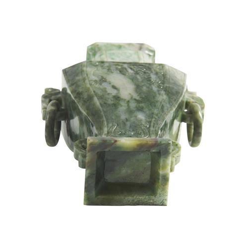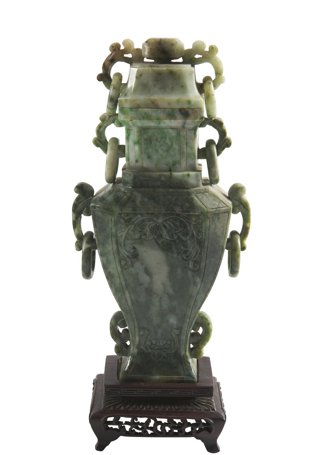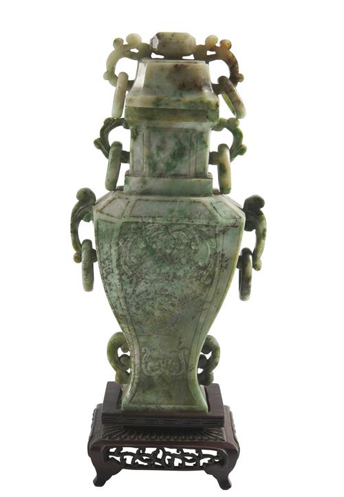 The faceted baluster form vase decorated with floral scrolls and rings, the grey jade with apple green inclusions, together with a carved hardwood base.