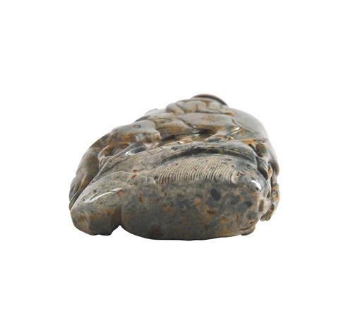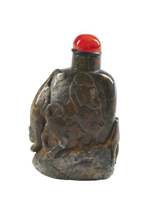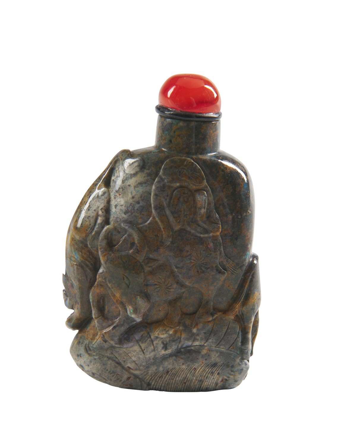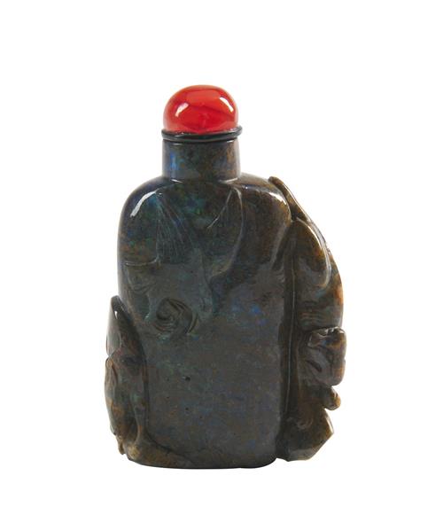 Carved with a boy on buffalo to one side and a horse tiger and bird to other. The opal with flashes of blue, green and red throughout, with a red hardstone stopper.