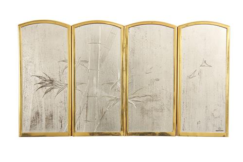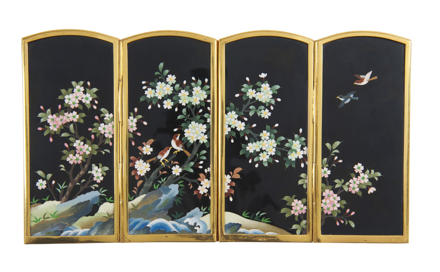 The four panel screen decorated with birds and blossoming cherry trees against a black ground. 'Made in Japan' beneath an Inaba mark.