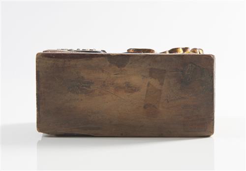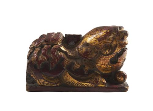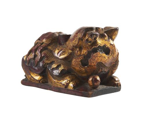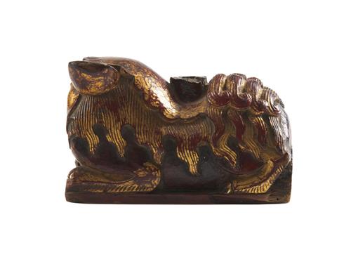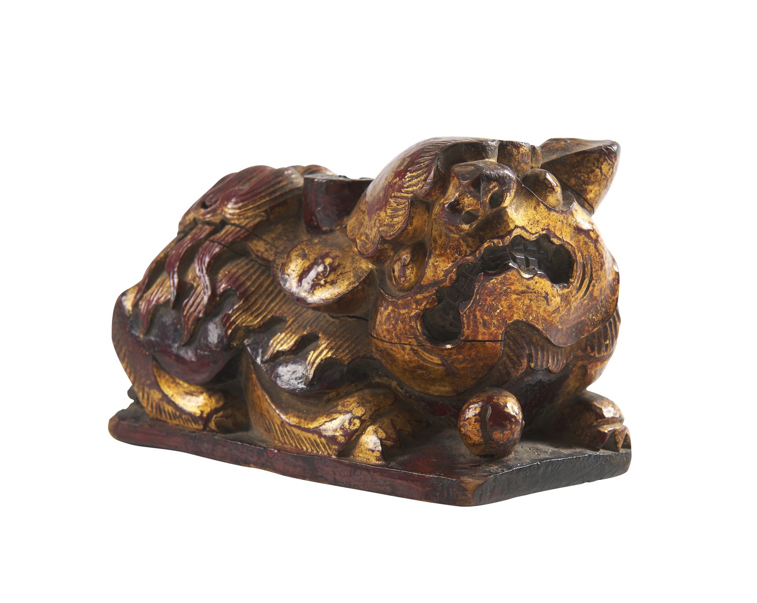 Carved in the form of a recumbent guardian lion, with red lacquer and remnant gilding.