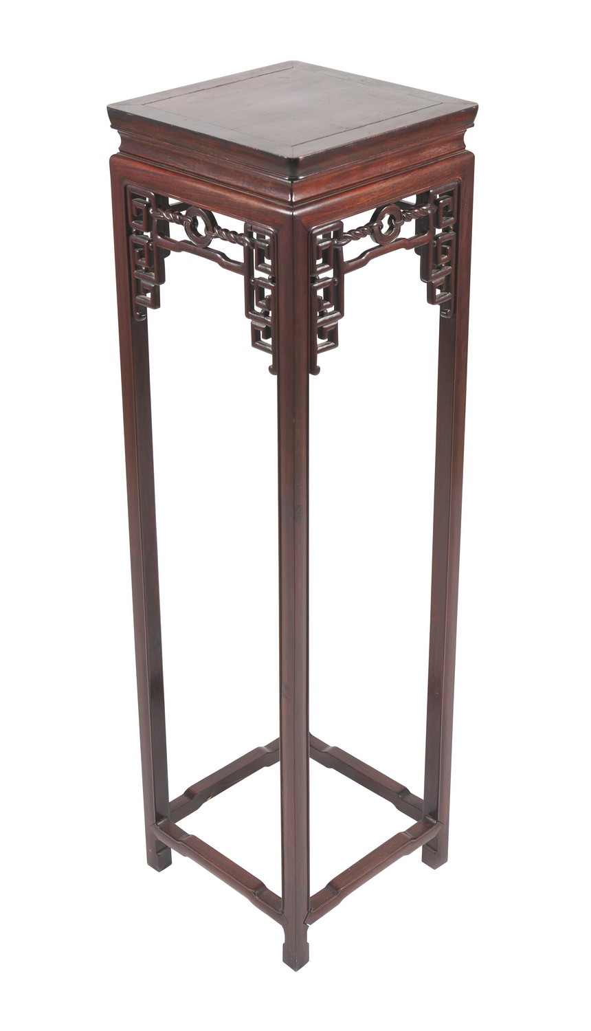 The tall square section stand with carved and pierced aprons, the legs joined by humpback stretchers at the base.