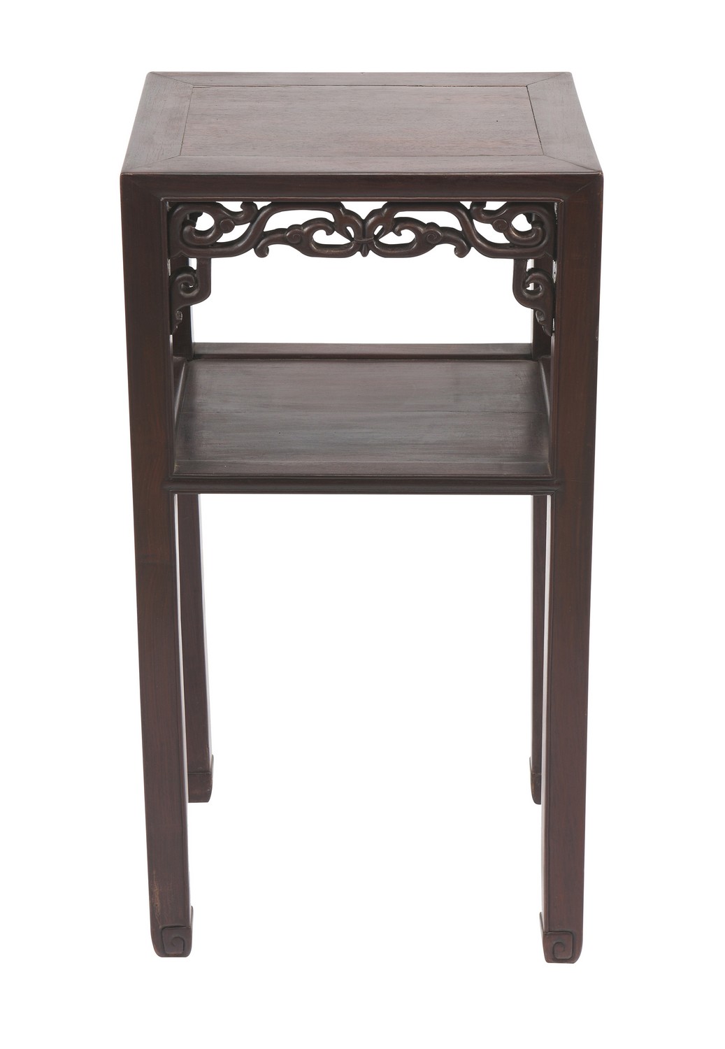 The two tiered stand with a carved and pierced apron of stylised scrolling foliage.