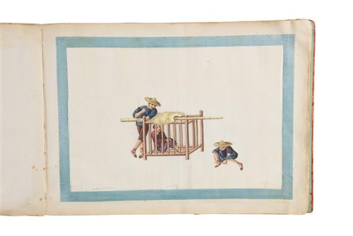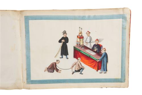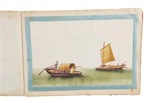 Comprising various boats and judgment scenes, in gouache on pith paper within the original silk covered album.