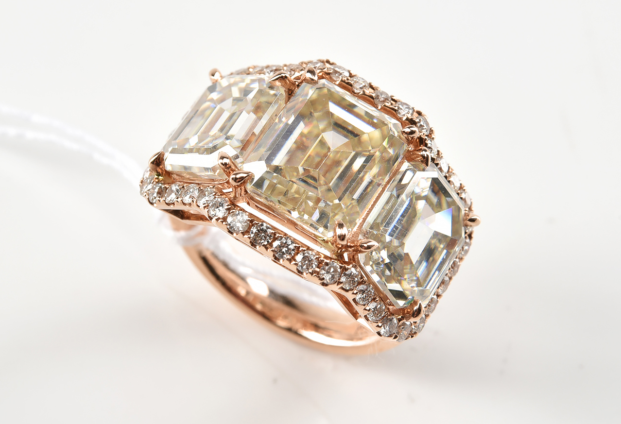 A MOISSANITE AND DIAMOND DRESS RING IN 18CT ROSE GOLD., WITH MOISSANITE TOTALLING 11.18CTS AND DIAMONDS TOTALLING 1.02CTS, SIZE M, 8.7GMS