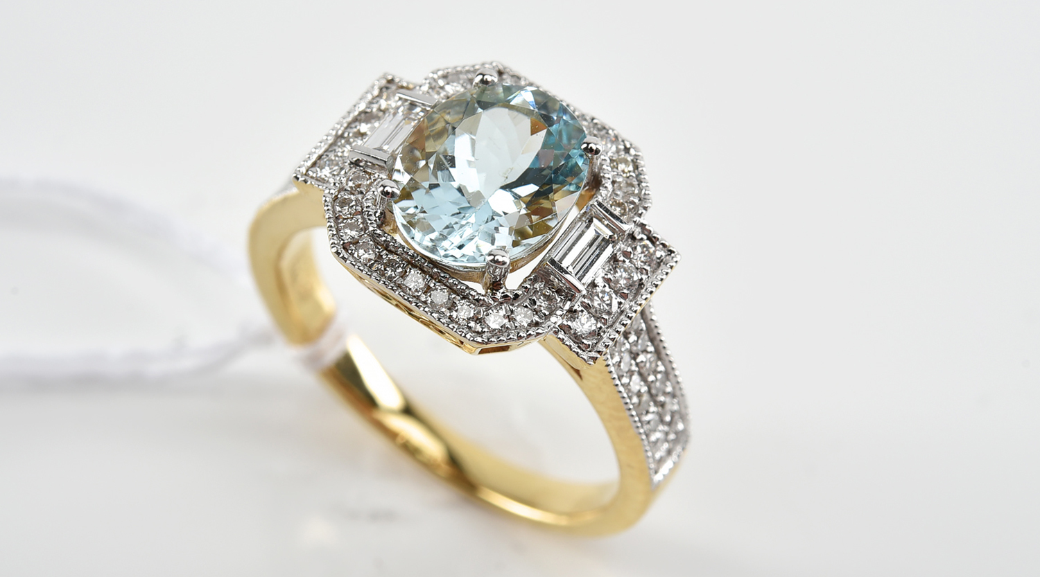 AN ART DECO STYLE AQUAMARINE AND DIAMOND DRESS RING IN 18CT GOLD, APPROXIMATE AQUAMARINE WEIGHT 2.00CTS, APPROXIMATE TOTAL DIAMOND WEIGHT 0.75CTS, SIZE N