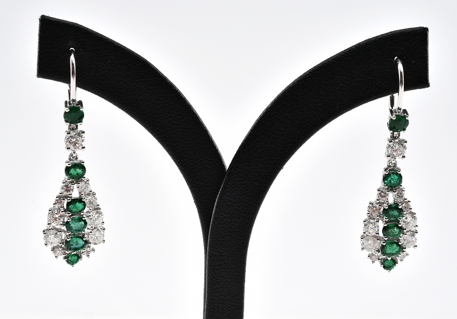 A PAIR OF EMERALD AND DIAMOND DROP EARRINGS IN 18CT WHITE GOLD TO CONTINENTAL HOOK FITTINGS, APPROXIMATE TOTAL DIAMOND WEIGHT 2.18CTS, APPROXIMATE TOTAL DIAMOND WEIGHT 2.35CTS.