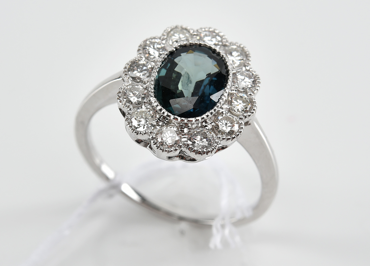 A SAPPHIRE AND DIAMOND CLUSTER RING IN 18CT WHITE GOLD, APPROXIMATE SAPPHIRE WEIGHT 1.03CTS, APPROXIMATE TOTAL DIAMOND WEIGHT 0.32CTS, RING SIZE M