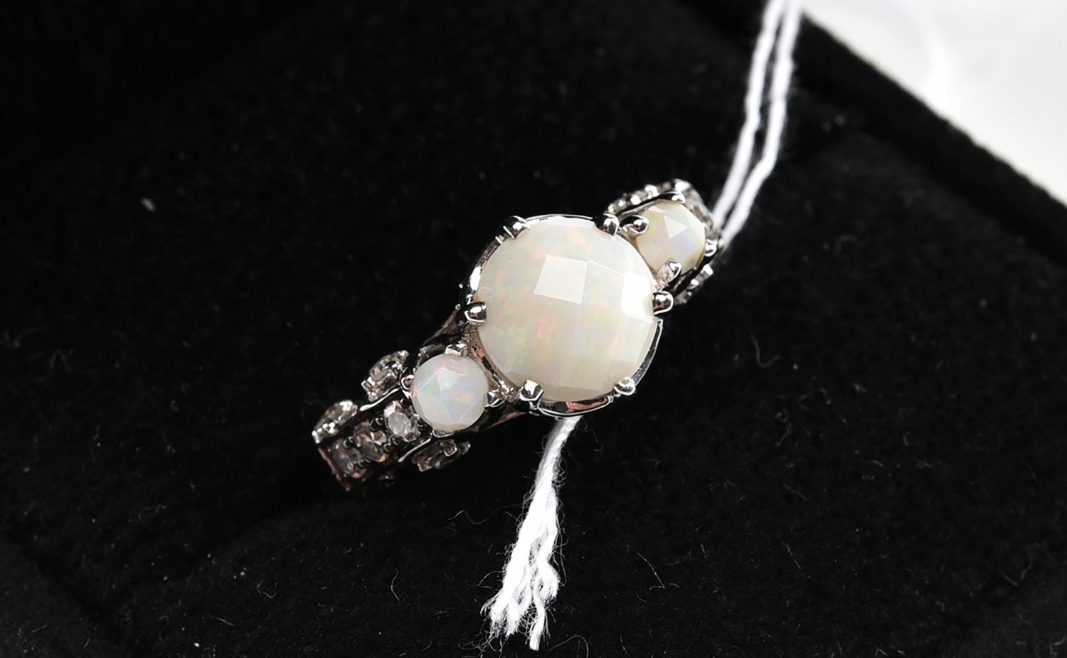 AN OPAL AND DIAMOND RING IN 14CT WHITE GOLD, SIZE M