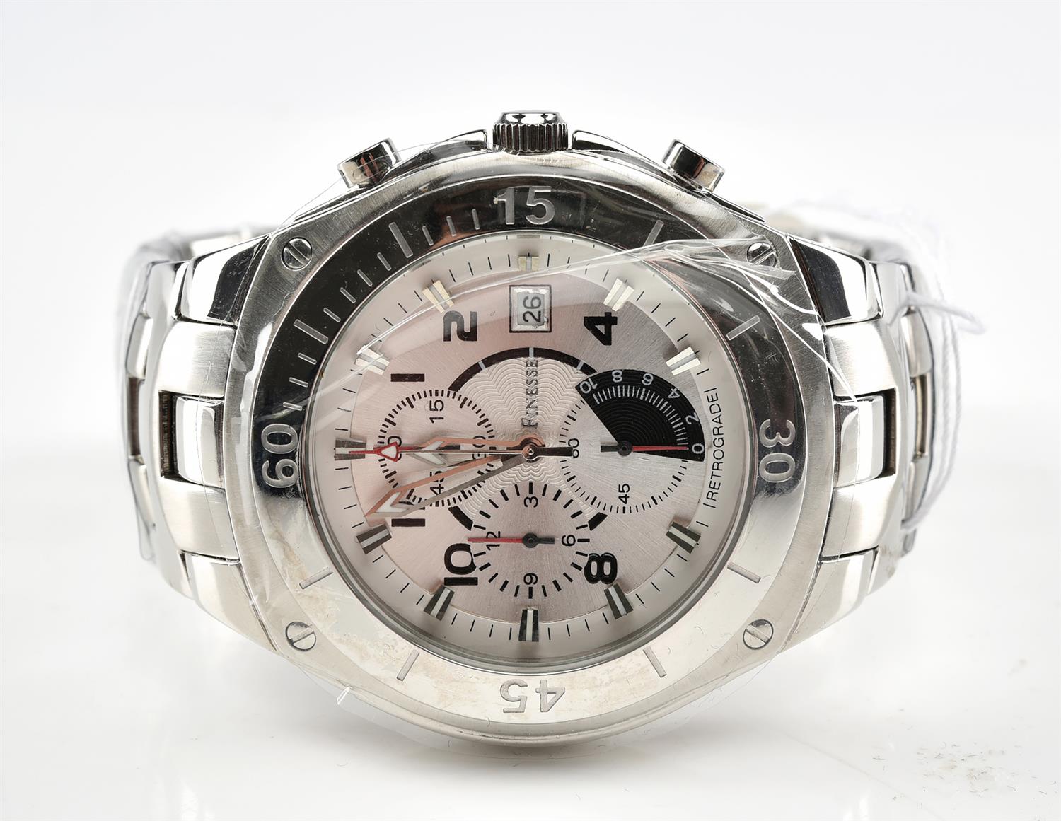 A FINESSE QUARTZ CHRONOGRAPH WRISTWATCH TO A STAINLESS STEEL CASE AND CONFORMING BRACELET BANDS.