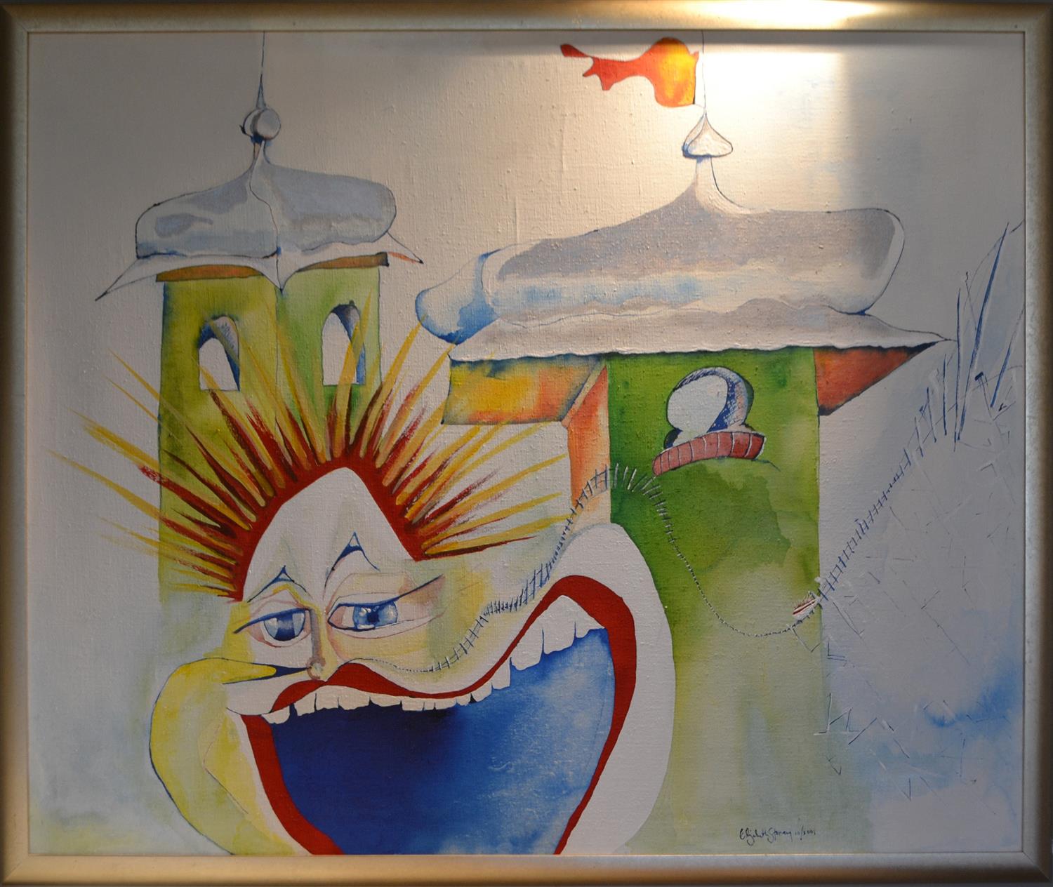 ELIZABETH STONEY, THE RUNAWAY RAILWAY, INK, GOUACHE AND CERMAIC ENAMEL ON CANVAS, 100 x 120CM, FRAME SIZE: 106 X 126CM, CONDITION: MINOR MARKS TO SURFACE