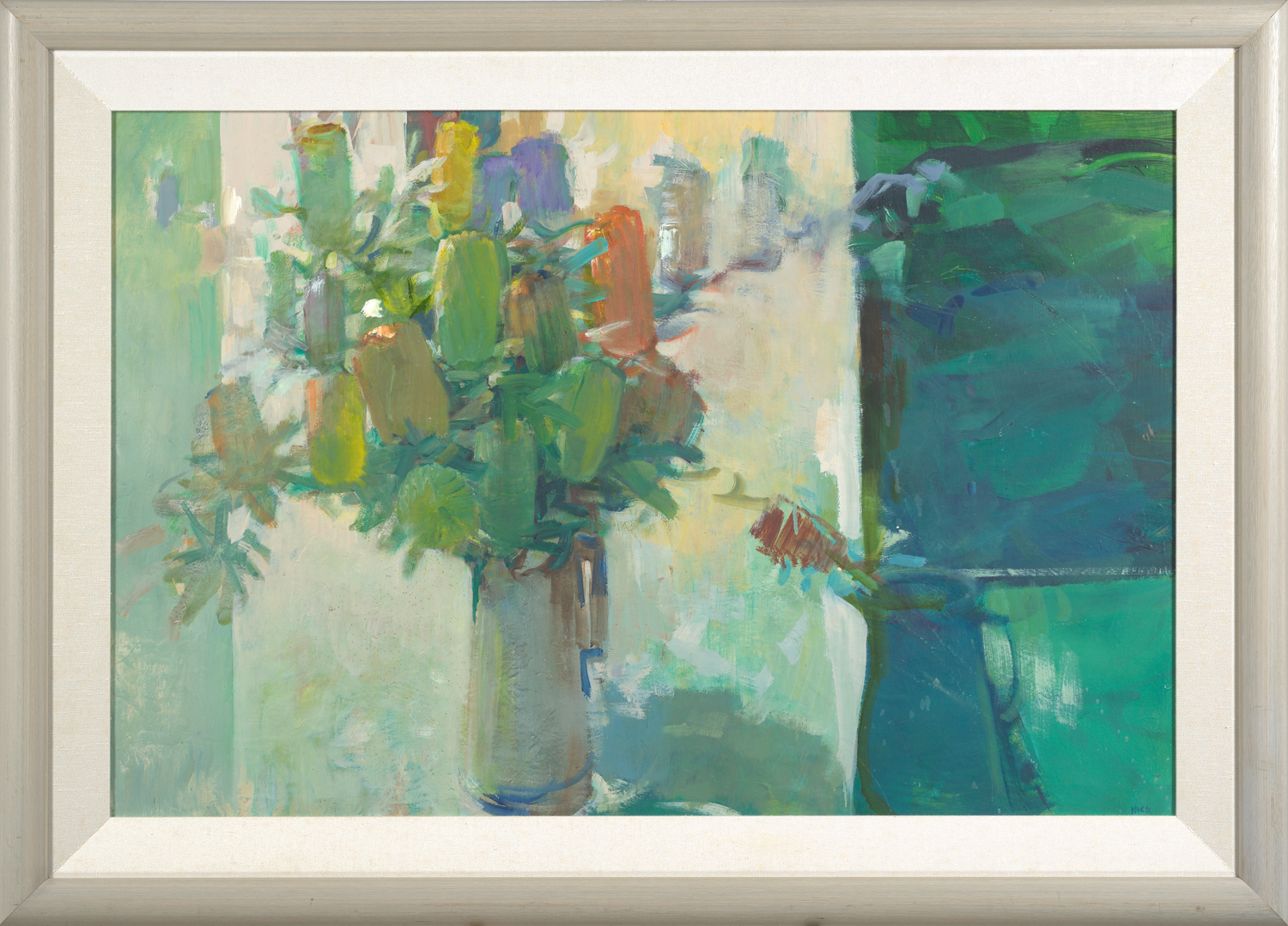 In good condition overall. There is some brown speckling focused around the left of the vase, with sporadic spots on the right hand side of the vase. There are whitened surface lines on the right hand side and within the blue jug, although these are likely from the artist's studio and therefore inherent. The work is well framed, with minor marks and scratches to the frame.