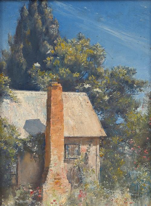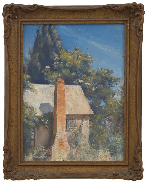 Happy Cottage, Goulburn Valley is revealing in its name alone, a tender work produced from happy memories just a short time before Roberts' wife passed. The picturesque cottage at the forefront is surrounded by idyllic blue sky, glistening sunlight, and perfectly tended flowers. Having been in the same family collection since 1928, this affectionate work points to a jovial period in Tom Roberts' life where perhaps he was painting less as for professional gain and more for personal enjoyment.