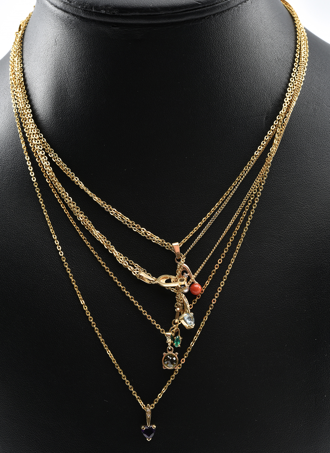 SIX ASSORTED PENDANTS SET WITH AMETHYST, SAPPHIRE, EMERALD ETC, ALL IN 9CT GOLD ON DISPLAY CHAINS