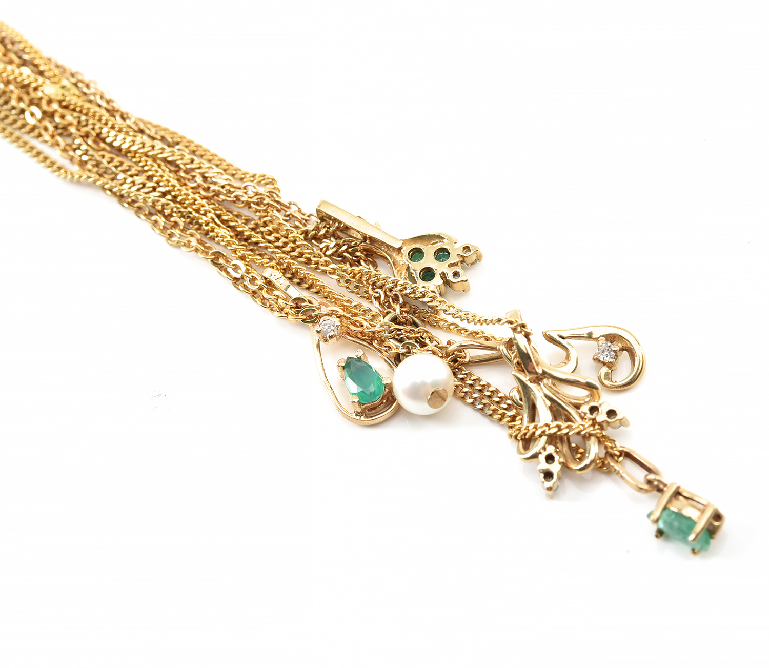 SIX ASSORTED PENDANTS SET WITH EMERALD, DIAMOND, PEARL ETC, ALL IN 9CT GOLD ON DISPLAY CHAINS