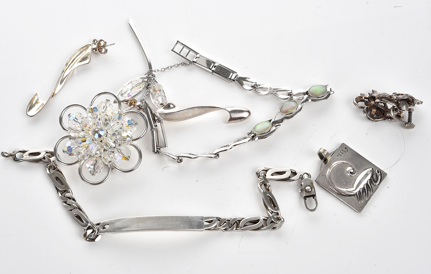 A COLLECTION OF SILVER AND BASE METAL JEWELLERY INCLUDING EARRINGS, PASTE FLOWER BROOCH, SCORPION SIGN PENDANT, AN OPAL BRACELET AND ID BRACELET