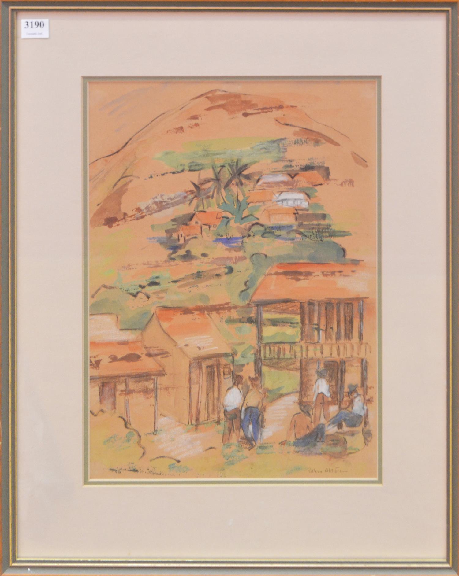 VALERIE ALBISTON, VILLAGE, WATERCOLOUR AND PASTEL ON PAPER, 37 X 27CM, FRAME SIZE: 53 X 42.5CM, CONDITION: MINOR FOXING AND FOUR CORNERS OF THE PAPER SHOW DISCOLOURATION, POSSIBLY FROM FRAMING TAPE