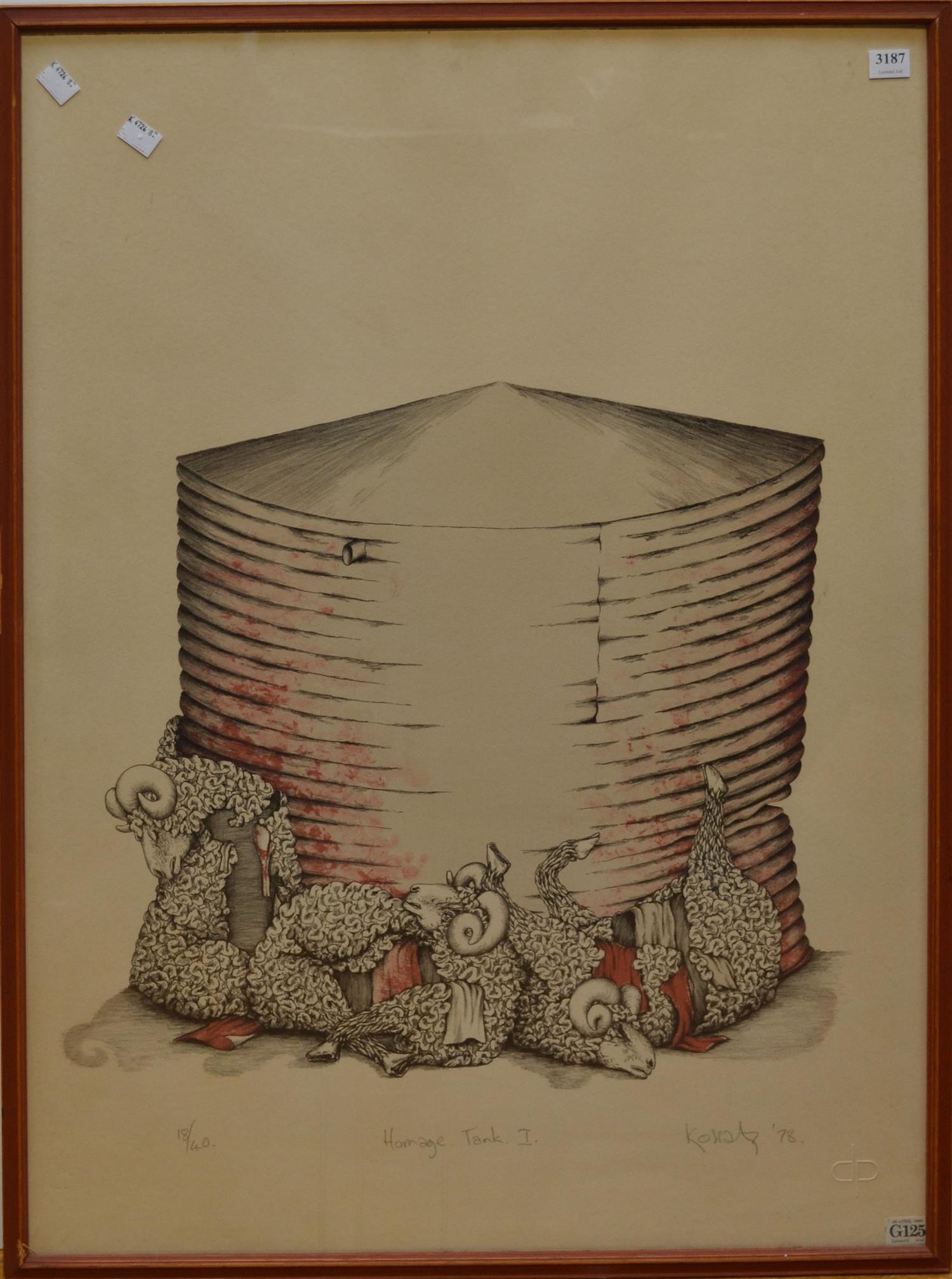 LES KOSSATZ, HOMAGE TANK I 1978. COLOUR LITHOGRAPH 18/40, 78 X 55CM (SHEET SIZE), FRAME SIZE: 79 X 56CM, CONDTION: DISCOLOURATION