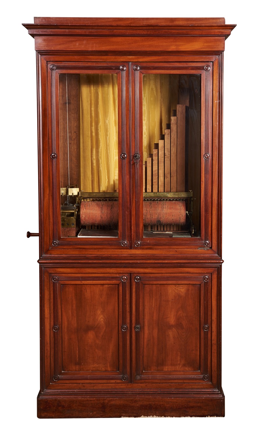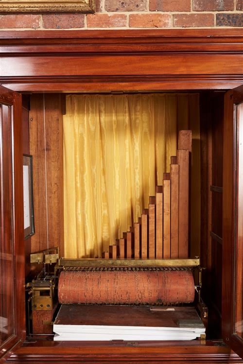 A rectangular mahogany cabinet with a pair of glazed doors to the upper section, providing access to the organ above a pair of blind panelled doors to the lower section. Behind the lower doors three full width drawers each with holders for two music barrels for the organ. Music mainly by Rossini. Weight driven movement with spiral action controlling bellows and supplying air to thirty two wooden pipes.