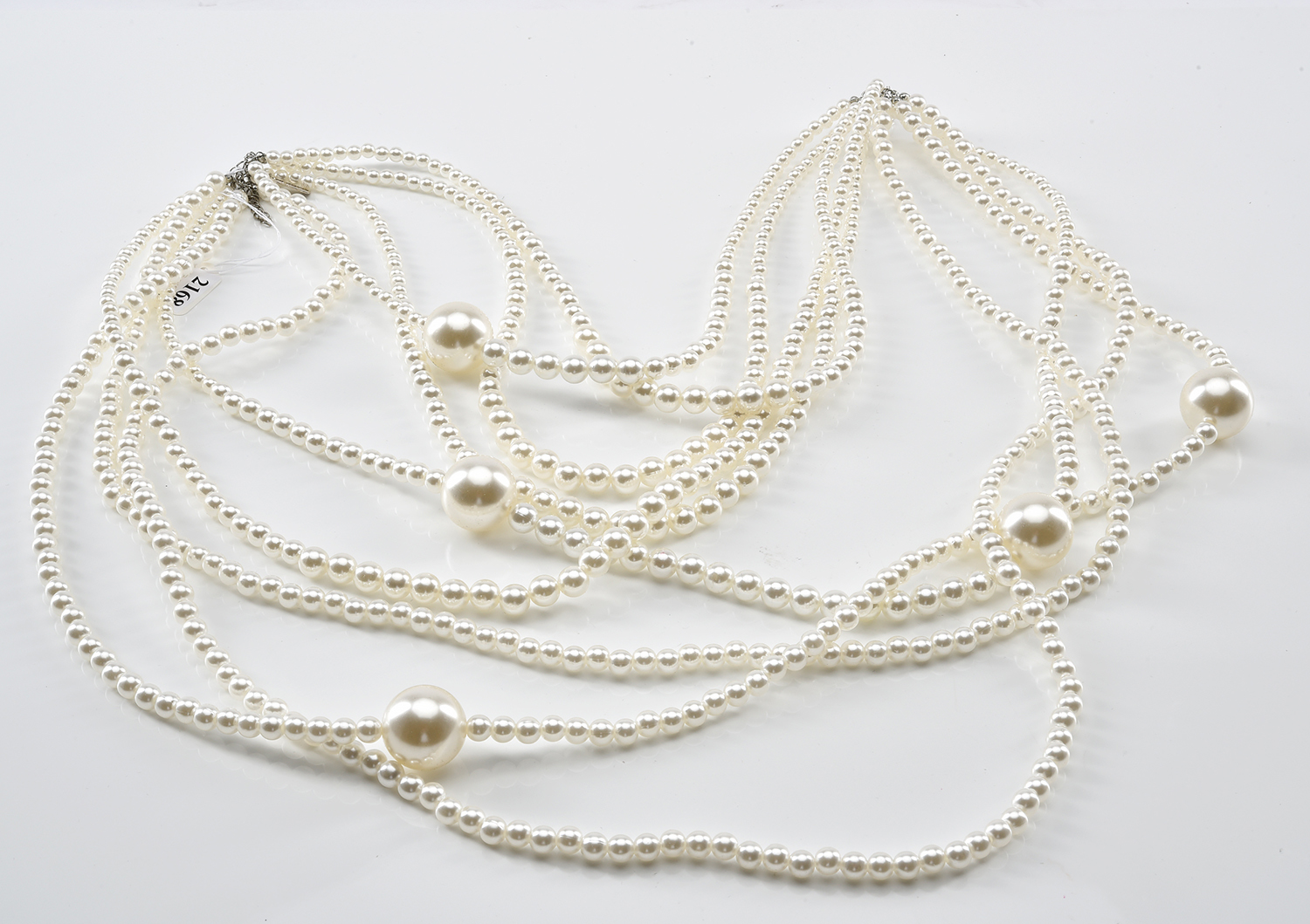 A NECKLACE BY OSCAR DE LA RENTA - The long multi strand necklace styled featuring faux pearls, with large faux pearl accents, to a silver tone lobster clasp.