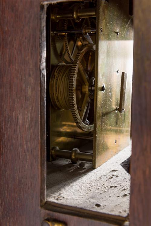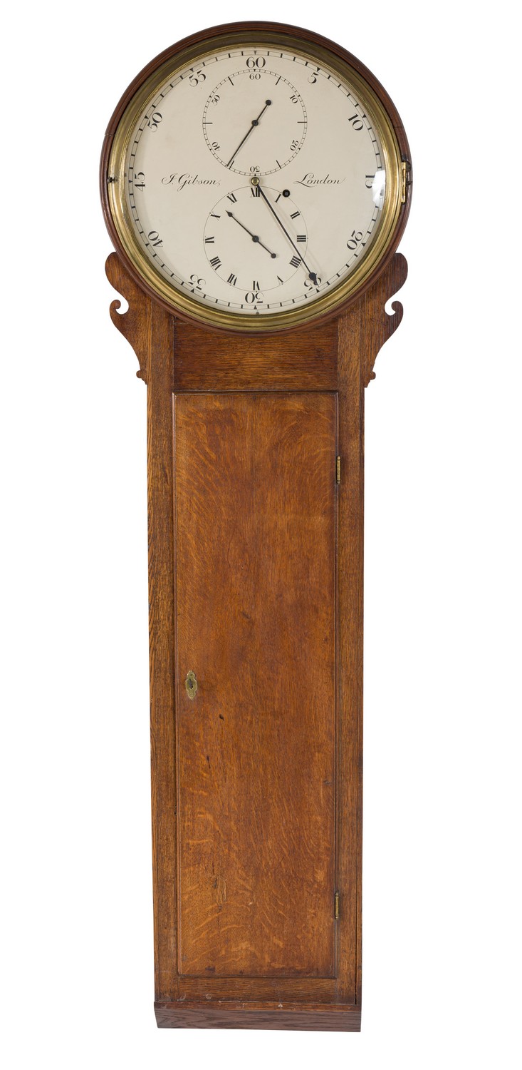 The oak cased weight driven regulator having a circular dial with two subsidiary dials with deadbeat escapement. Signed J. Gibson, London to dial.