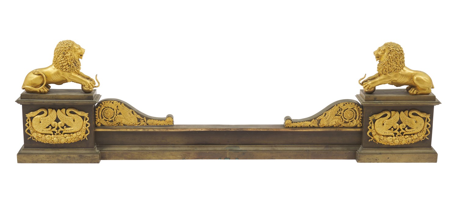 In the form of two plinths surmounted with opposed crouching lions in gilded bronze, above heraldic releifs of paired swans holding festoons, the front fender mounted with two brackets also applied with gilded bronze reliefs featuring swans