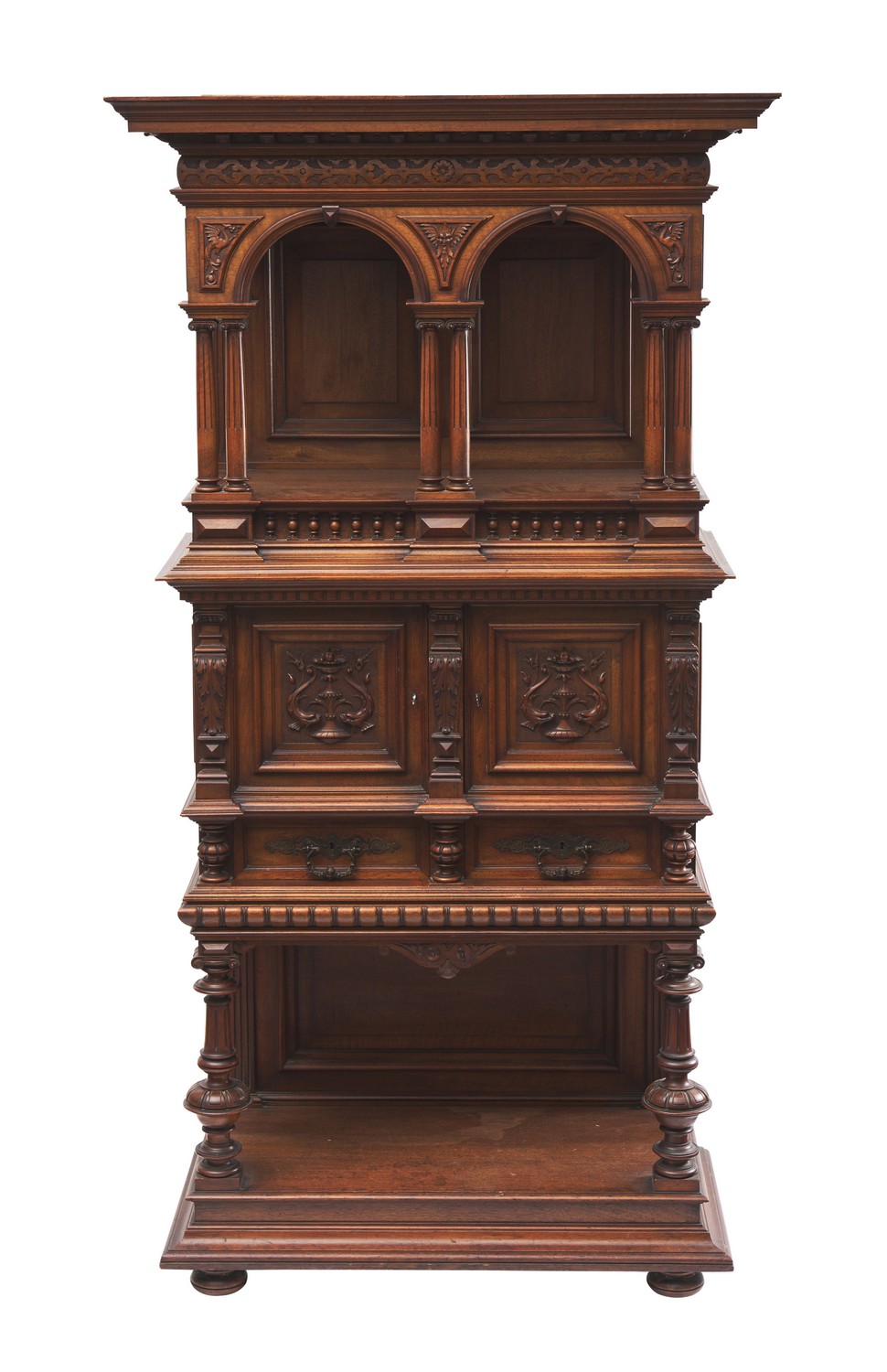 Having a deep moulded cornice and fascia, above carved mythological motifs, the arcade of two arches supported on corinthian columns enclosing a recessed space, above two doors with decorative carved panels, two drawers, and another recess at the bottom, flanked with turned supports, the whole raised on bun feet