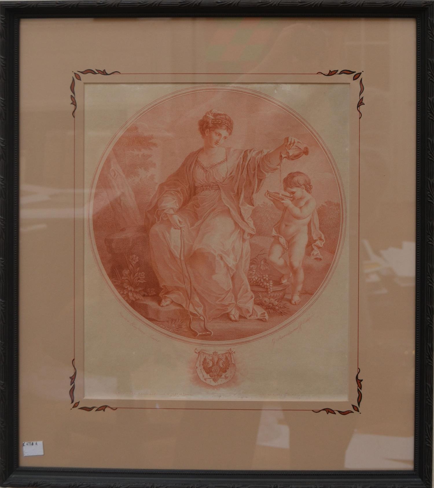ANGELICA KAUFFMAN, UNTITLED, ENGRAVING, 36 X 30CM, FRAME: 55 X 50CM, CONDITION: HEAVY DISCOLOURATION AND FOXING THROUGHOUT, LEONARD JOEL DELIVERY SIZE: MEDIUM