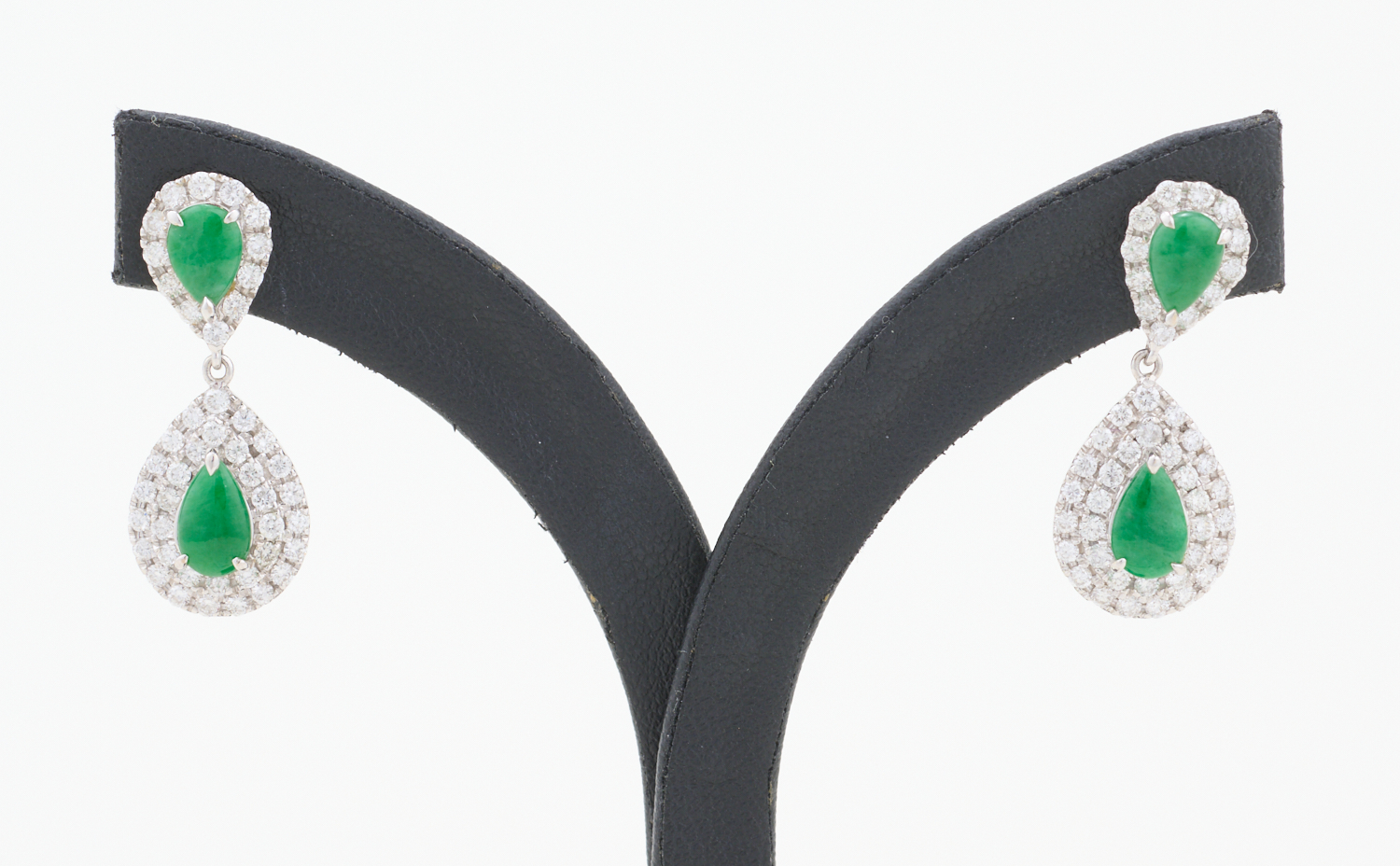 A TYPE A JADE AND DIAMOND RING IN 18CT WHITE GOLD, THE DIAMONDS TOTALLING 1.38CTS, WITH JJA CERTIFICATION, SIZE N, 10GMS