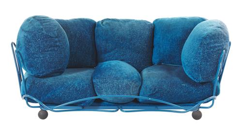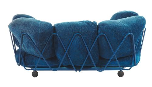 Textured blue velvet upholstery on powder coated metal frame with rubber feet
