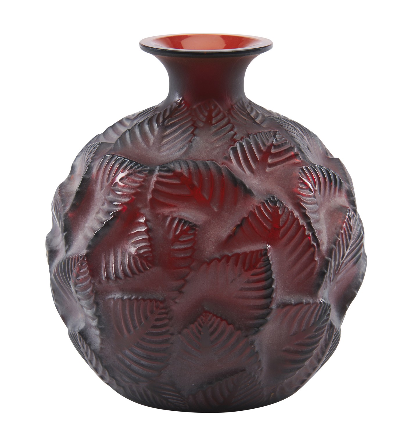 Of globular bottle form with a flared rim, with moulded feuillages (foliage) pattern in deep amber glass