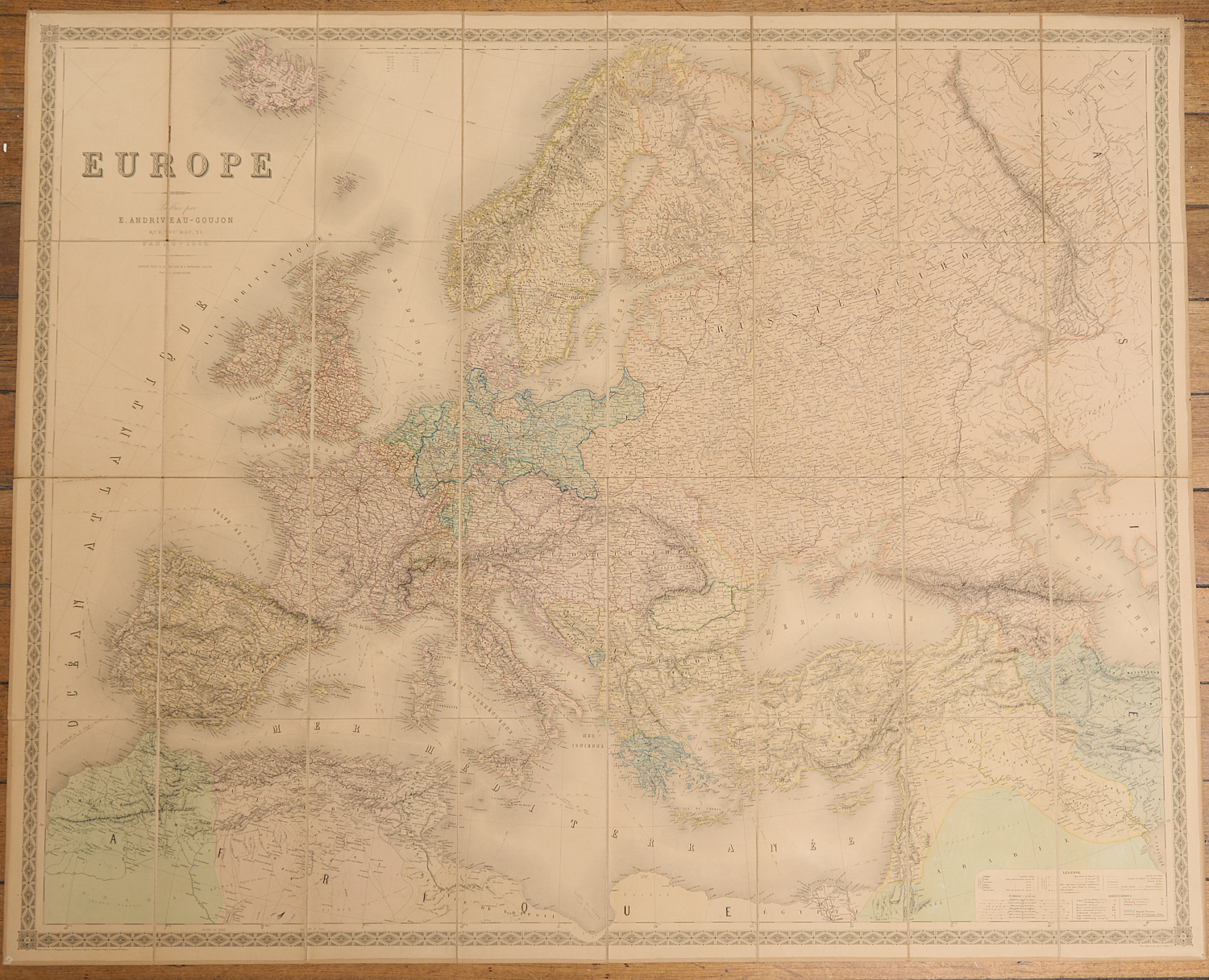 A VINTAGE LINEN BACKED FOLDABLE MAP OF EUROPE, E.ANDRIVEAU-COUJON, RUE BAC. 21, 133 x 108CM, LEONARD JOEL LOCAL DELIVERY SIZE: SMALL