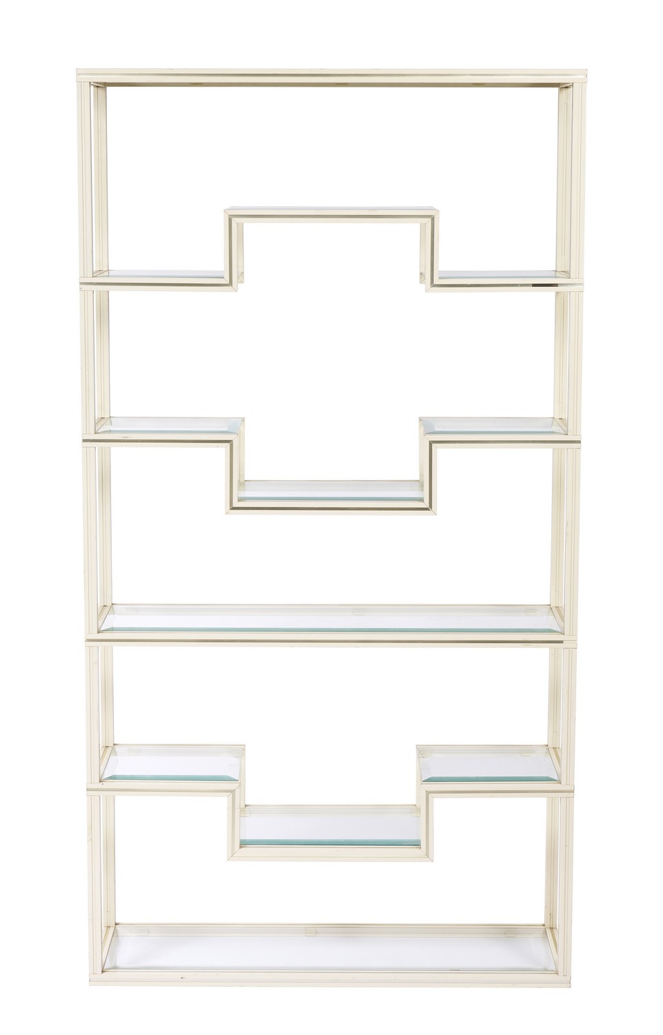 Cream painted metal and gilt frame with bevelled glass shelves