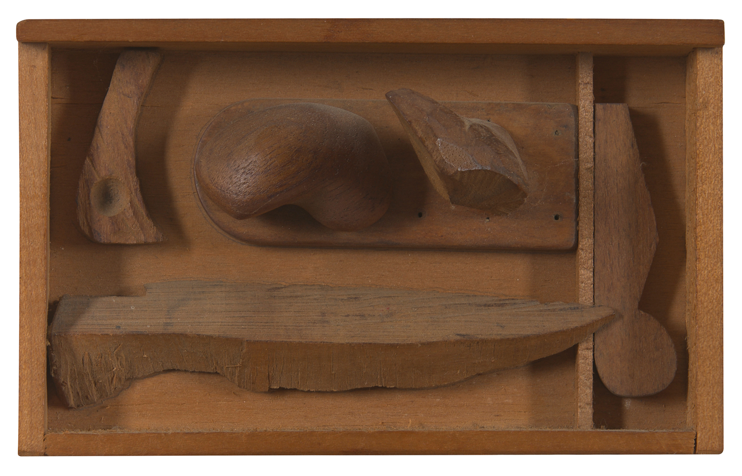 Work in very good condition. Wood is stable with no loose joints. Wood pieces are fully intact and are stable when hung. A hairline split in the wood is seen from the back where the eyelets have been screwed for hanging- present on both sides.
