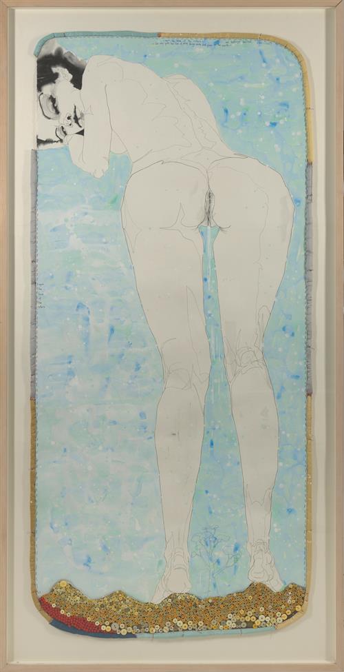 watercolour, buttons, embroidery cotton, silk and collage on paper with satin and cotton border