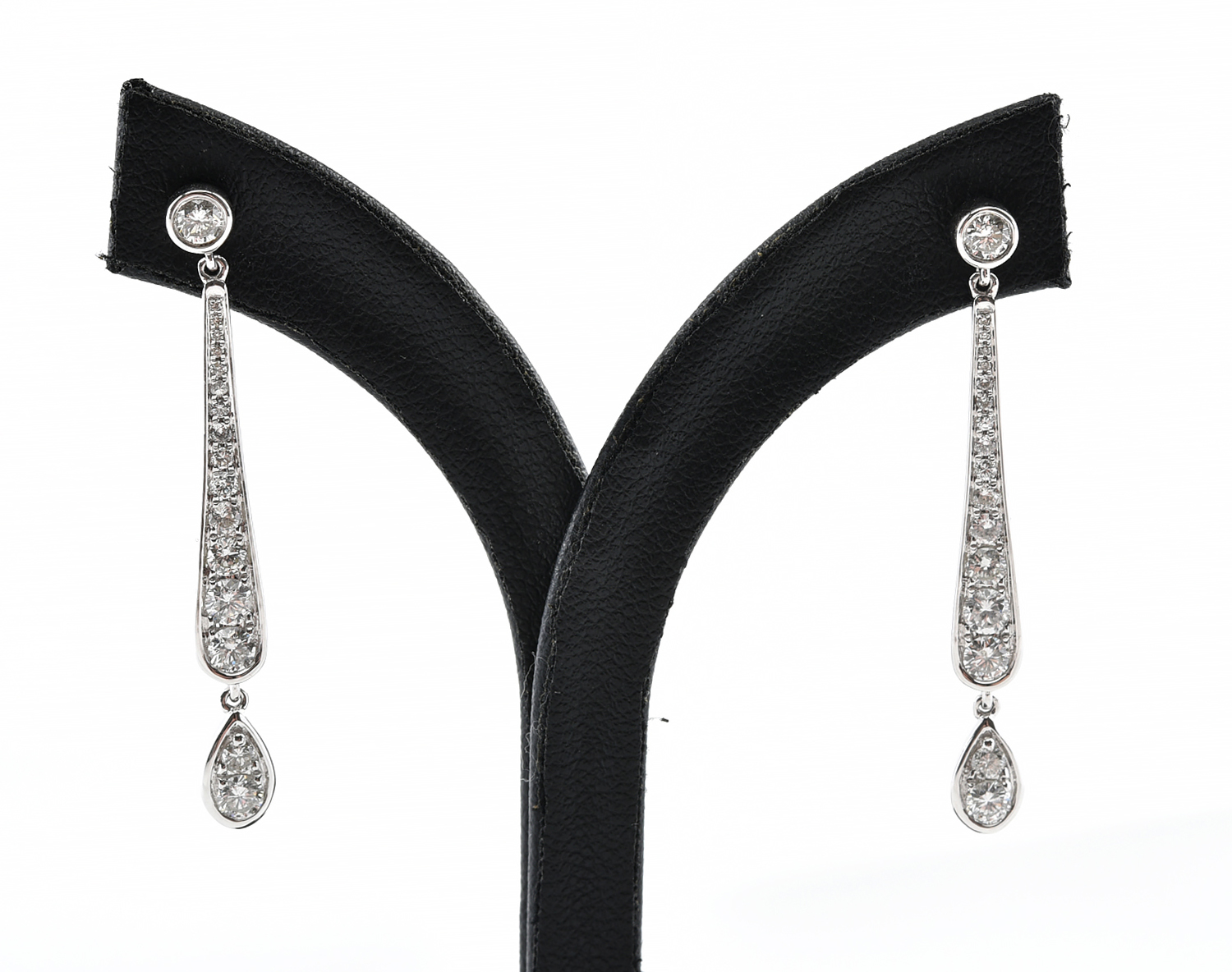 Earrings present in as new condition with all diamonds secure in their setting. Earrings measure approximately 40mm in length. Total diamond weight 34 = 1.19ct Estimated colour G to H, estimated clarity SI to P1. Total weight of earrings 5.21grams.