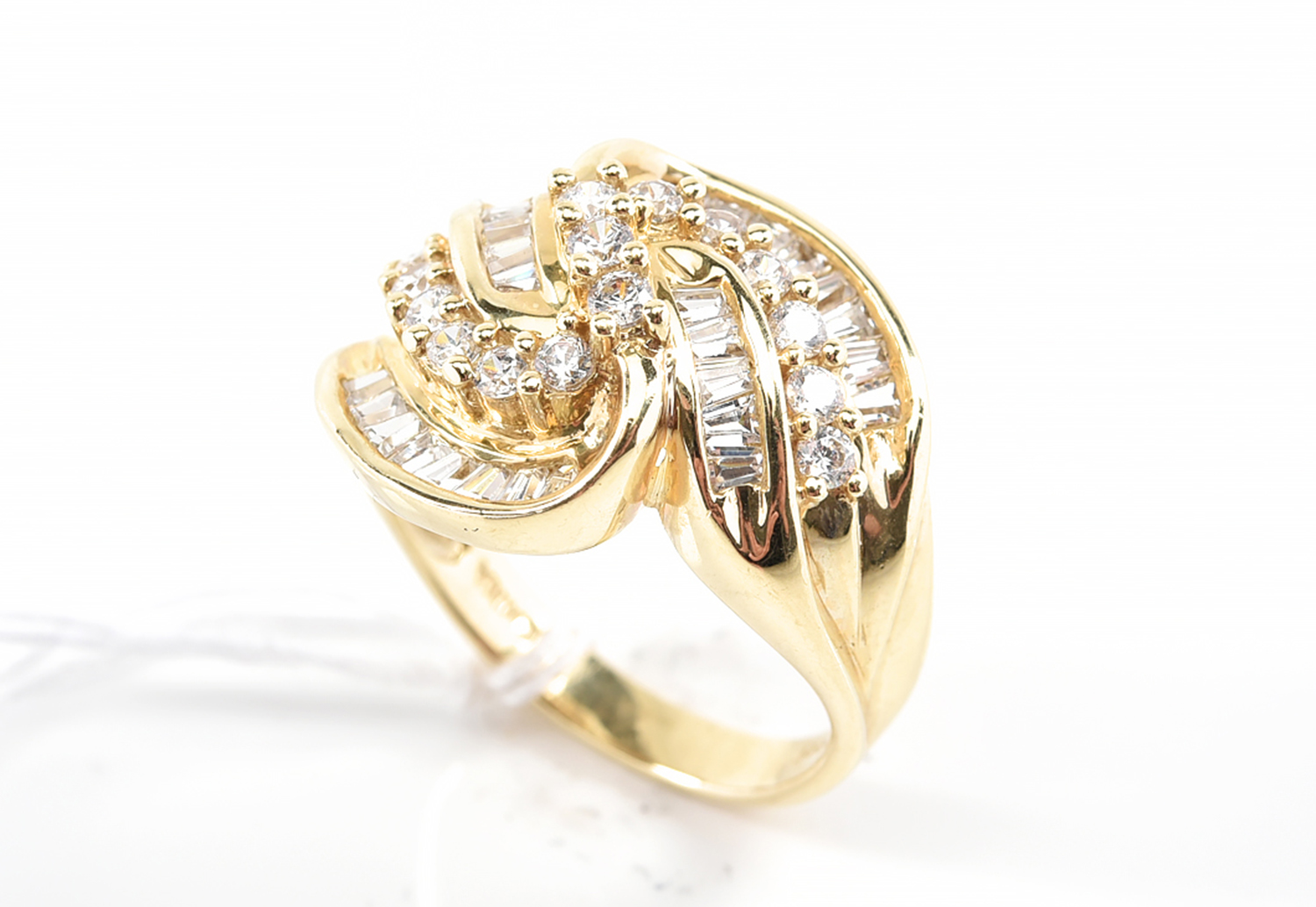 Ring presents in excellent condition with all diamonds secure in their settings. Fifteen round brilliant cut diamonds totalling approximately 0.45ct, estimated colour G to H, estimated clarity VS to SI, twenty six tapered baguette cut diamonds totalling approximately 0.52ct estimated colour G to H, estimated clarity VS to SI. Total weight 5.98grams