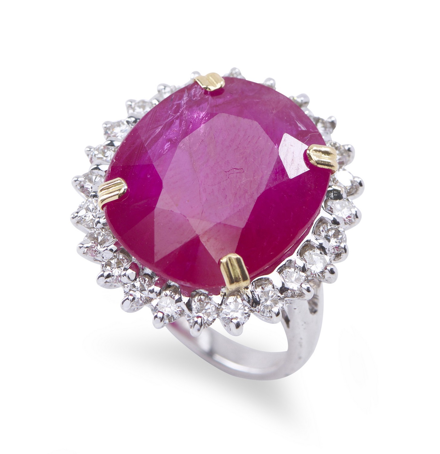 In excellent as new condition. AIG certificate states colour as a Vivid Red, on inspection the colour the colour is best described as a solid deep pink. Diamonds estimated colour G-H and clarity VS-SI.