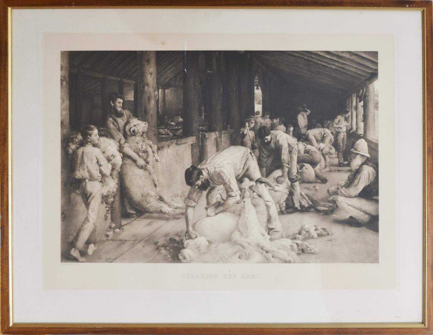 AFTER TOM ROBERTS, SHEERING THE RAMS, REPRODUCTION PRINT, 50 X 75CM FRAME SIZE: 80 X 103CM