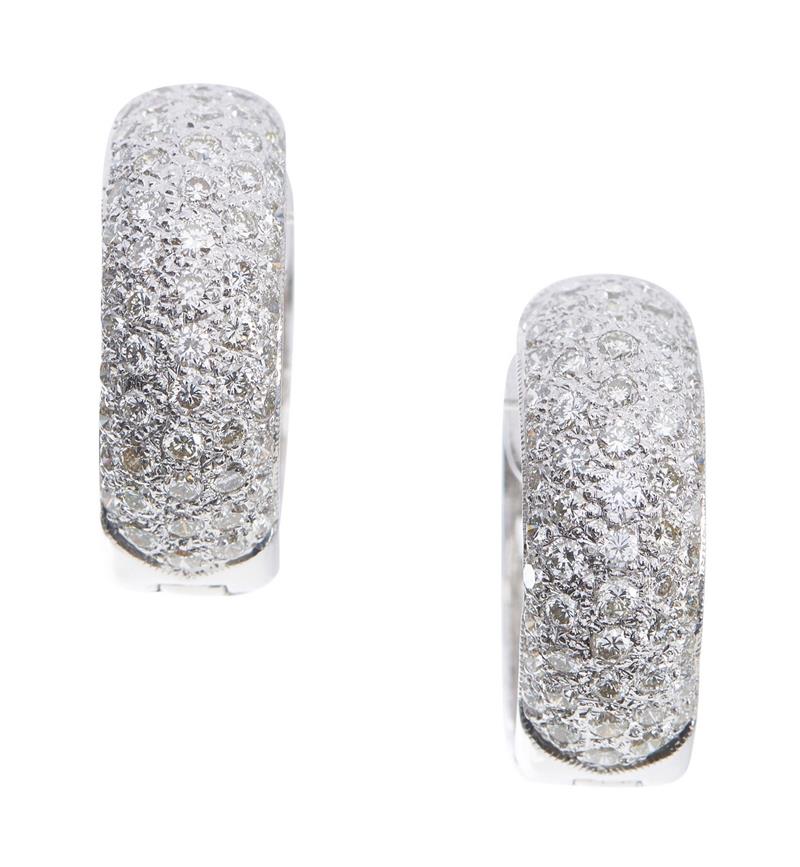 Each wide hoop pavé set with round brilliant cut diamonds totalling an estimated 3.20cts, in 18ct white gold.