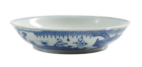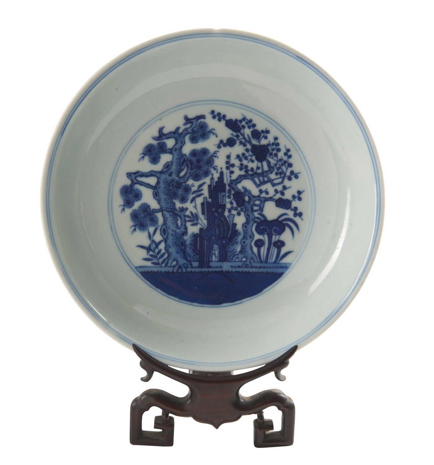 Decorated to the interior with a roundel of pine, plum, bamboo, rocks and lingzhi fungus, the exterior decorated with a garden scene of boys playing under the watchful gaze of a seated lady. Six character mark for Daoguang to the base. Together with a 19th century fitted hardwood stand.