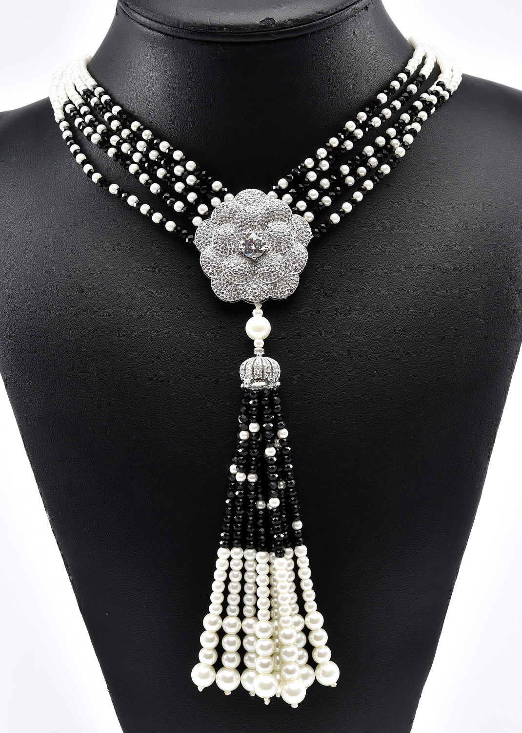 A PEARL, ONYX AND VERMIEL NECKLACE WITH FLORAL CENTRE PIECE AND TASSLE, IN STERLING SILVER AND 18CT WHITE GOLD