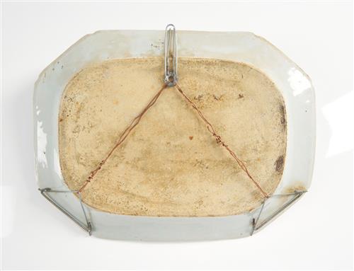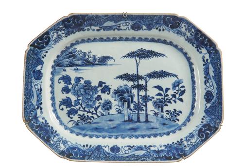 Decorated with a stylized landscape, surrounded by rococo scrolls, flowers and butterflies to the rim, the base underglazed.