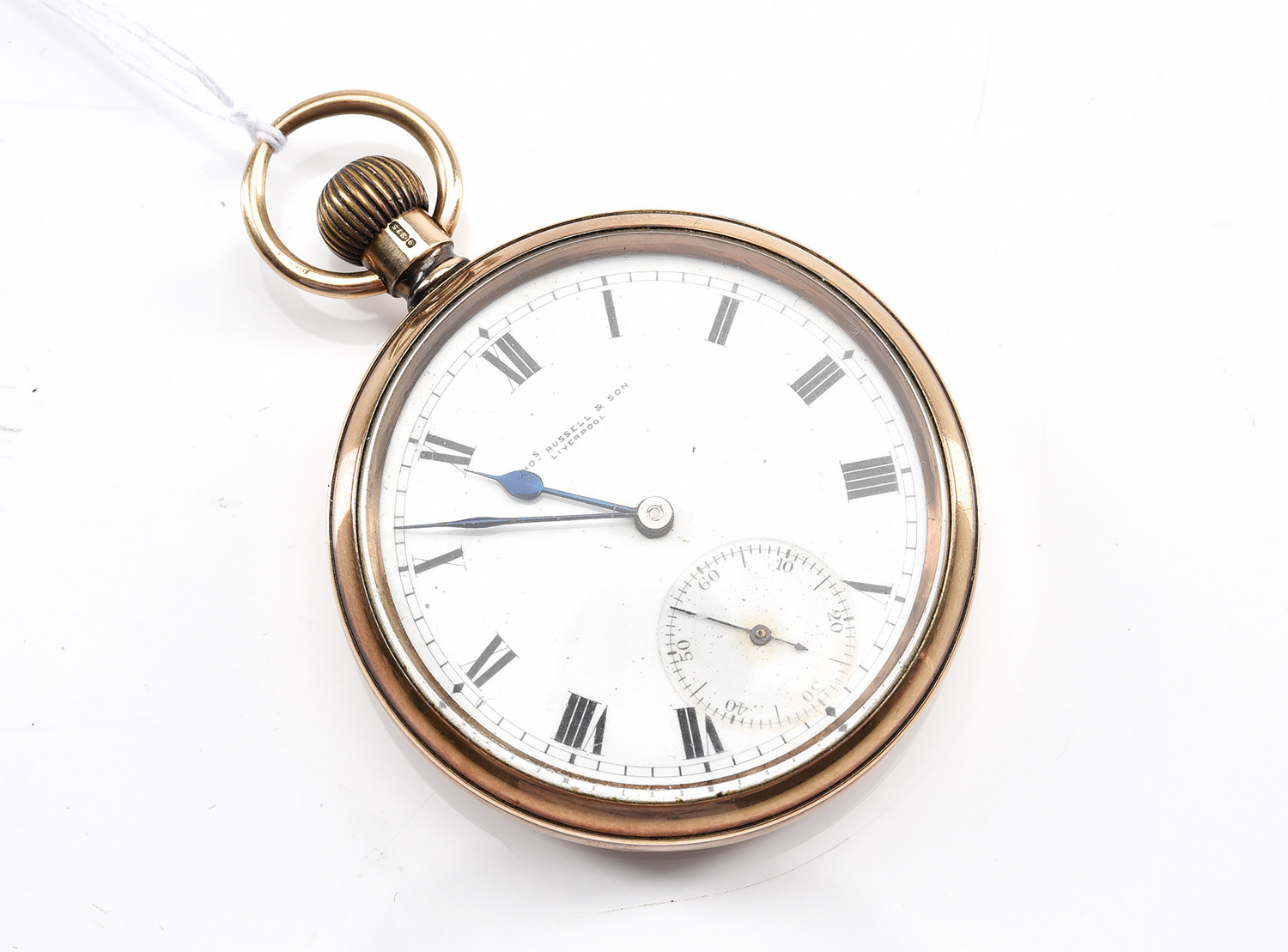 AN ANTIQUE THOMAS RUSSELL & SON FOB WATCH, LIVERPOOL, MECHANICAL MOVEMENT, WHITE ROUND DIAL WITH ROMAN NUMERALS, HALLMARKED CHESTER, CIRCA 1915, IN 9CT GOLD, TOTAL WEIGHT 76.5GMS