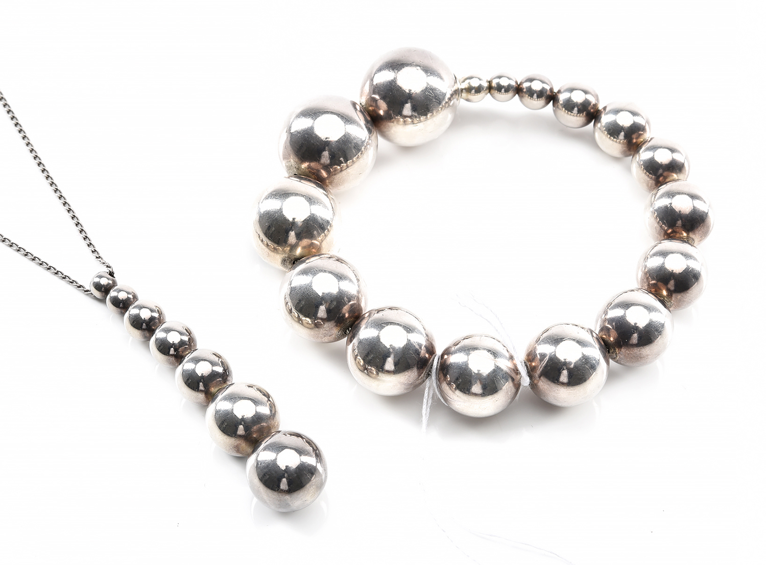 A SILVER JEWELLERY SUITE BY GEORG JENSEN From the Cave range, the pendant and bracelet comprising graduating spherical links, with concave detail, in sterling silver, reference 441.