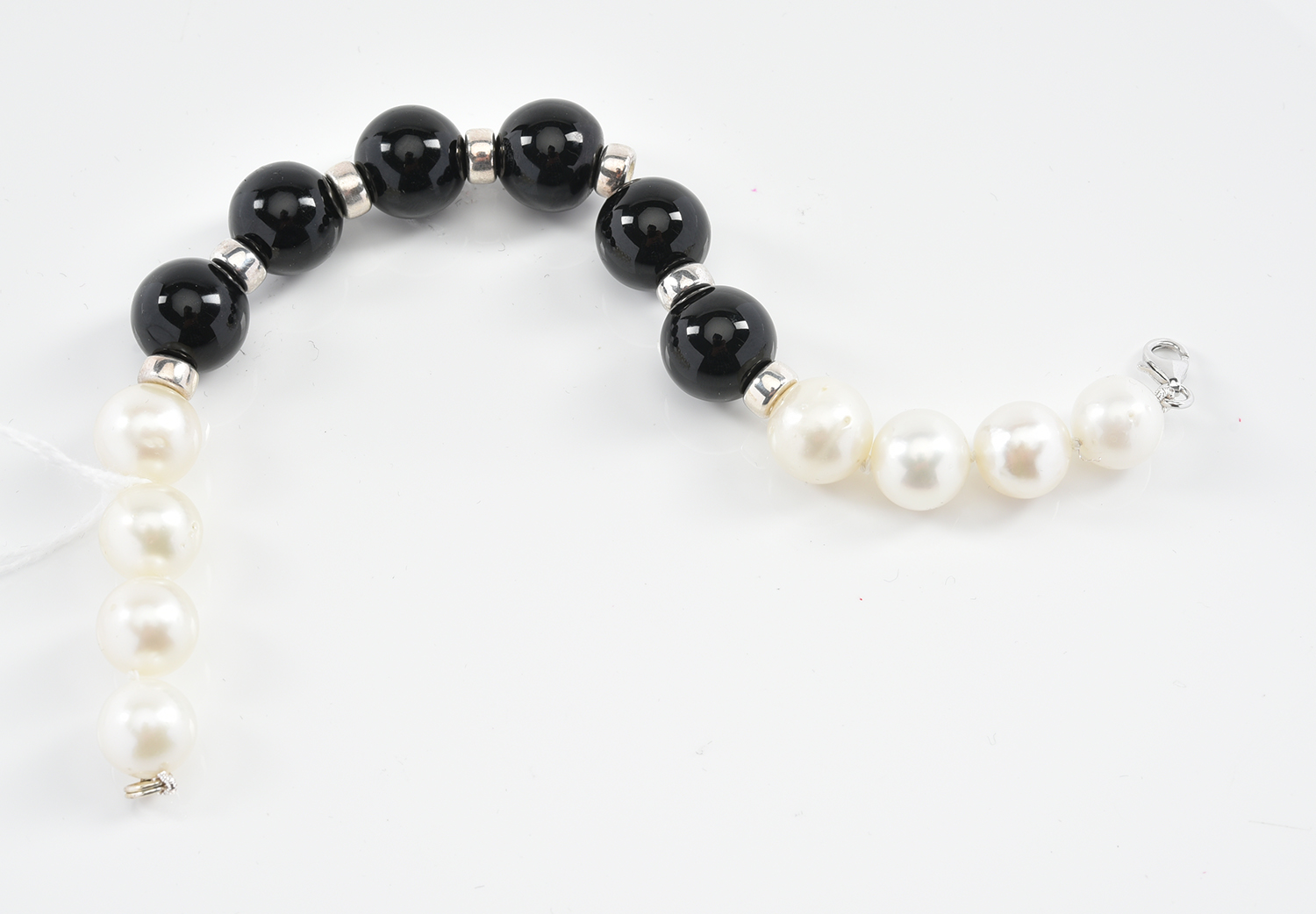 A BAROQUE SOUTH SEA PEARL AND ONYX BRACELET TO A SILVER CLASP, TOTAL LENGTH 180MM