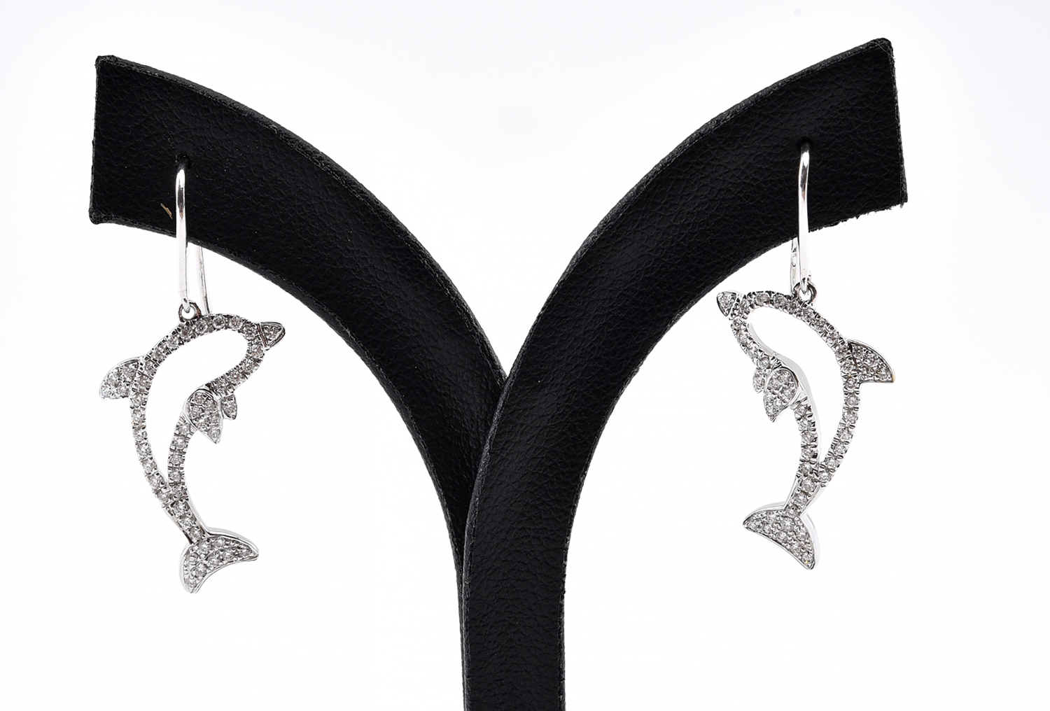A PAIR OF DIAMOND EARRINGS IN 18CT WHITE GOLD FEATURING DOLPHINS, TO SHEPHERD HOOK FITTINGS, LENGTH 20MM