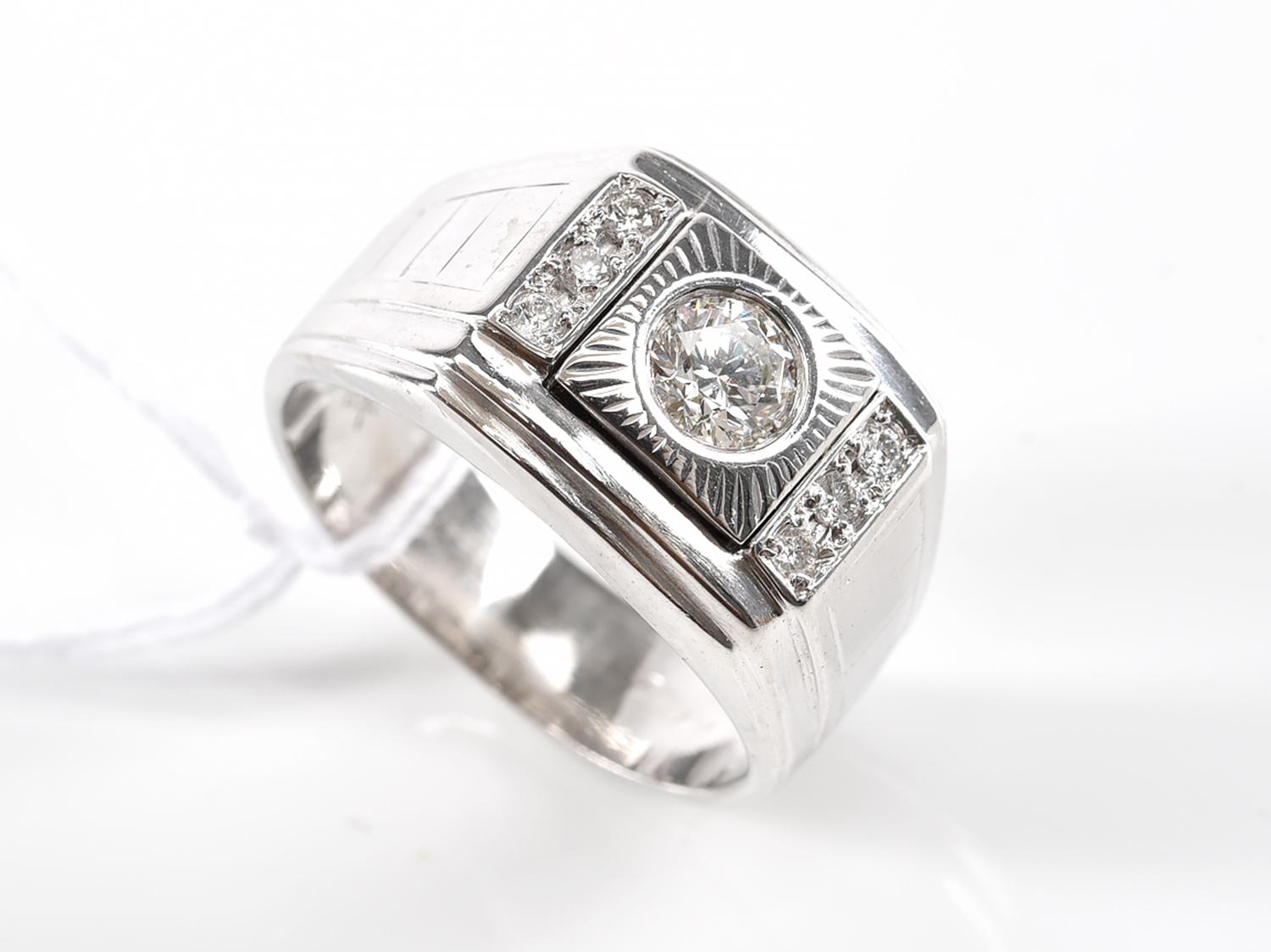 A GENTLEMAN DIAMOND SIGNET RING IN 18CT WHITE GOLD, SIZE O, 9.3GMS