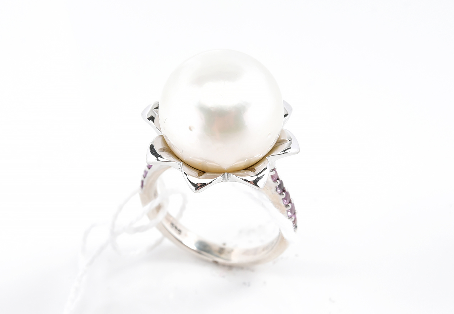 A SOUTH SEA PEARL AND PINK SAPPHIRE RING BY AUTORE IN STERLING SILVER, SIZE O